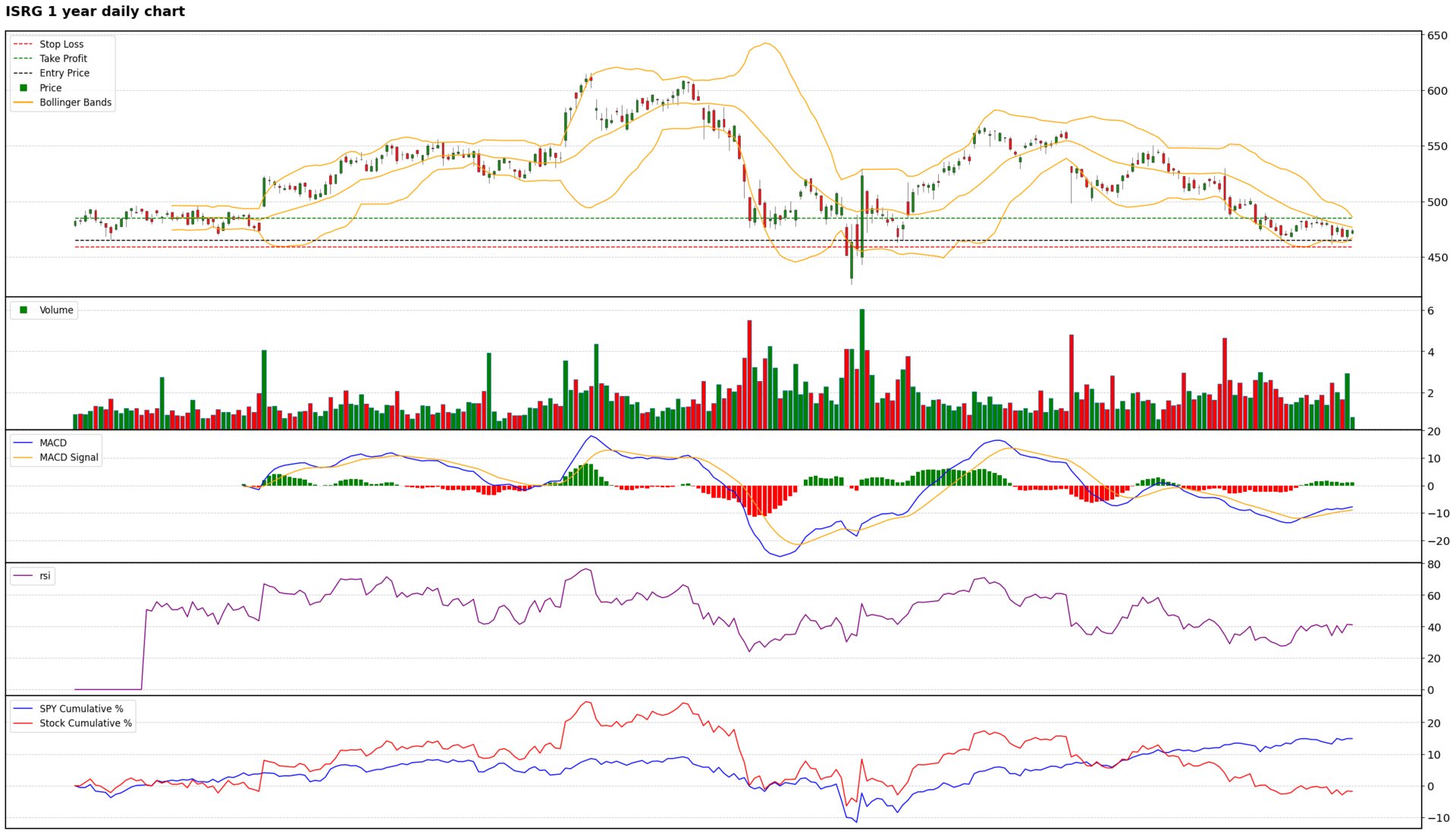 Intuitive Surgical (ISRG) remains a high-quality, market-leading company with a strong competitive moat, robust financial performance, and a clear innovation roadmap, particularly with the da Vinci 5 system. Management's confidence and proactive strategies, coupled with largely bullish analyst sentiment, underscore its long-term growth potential. However, the stock's current valuation is exceptionally high, pricing in significant future growth and posing a considerable risk to short-term returns. While technicals suggest nascent bullish momentum, a potential short-term pullback is indicated. Therefore, a tactical 'Long' position is recommended only on a dip to strong support levels, allowing investors to benefit from the company's fundamental strength while managing valuation risk. The trade setup offers a favorable risk/reward ratio, but position sizing should be conservative given the overall market sensitivity and valuation concerns.