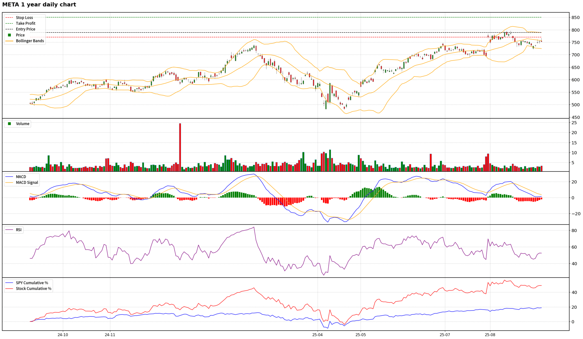 Meta Platforms presents a compelling long-term investment opportunity, underpinned by its aggressive and strategic pivot towards AI and Superintelligence, which is already yielding significant improvements in its core, highly profitable advertising business. Despite massive capital expenditures and ongoing losses from Reality Labs, management's high confidence and demonstrated execution in AI provide a strong growth narrative. Analyst sentiment is overwhelmingly bullish, with significant upside potential indicated by price targets. While current valuation metrics appear stretched relative to peers, the company's robust earnings growth and future AI-driven opportunities could justify this premium. Technically, the stock is in a strong bullish trend, though recent indecision and weakening momentum near resistance suggest a cautious approach. A breakthrough above key resistance levels would confirm renewed bullish momentum, making a tactical long position with disciplined risk management a viable strategy, despite the significant regulatory and legal headwinds that pose near-term risks.