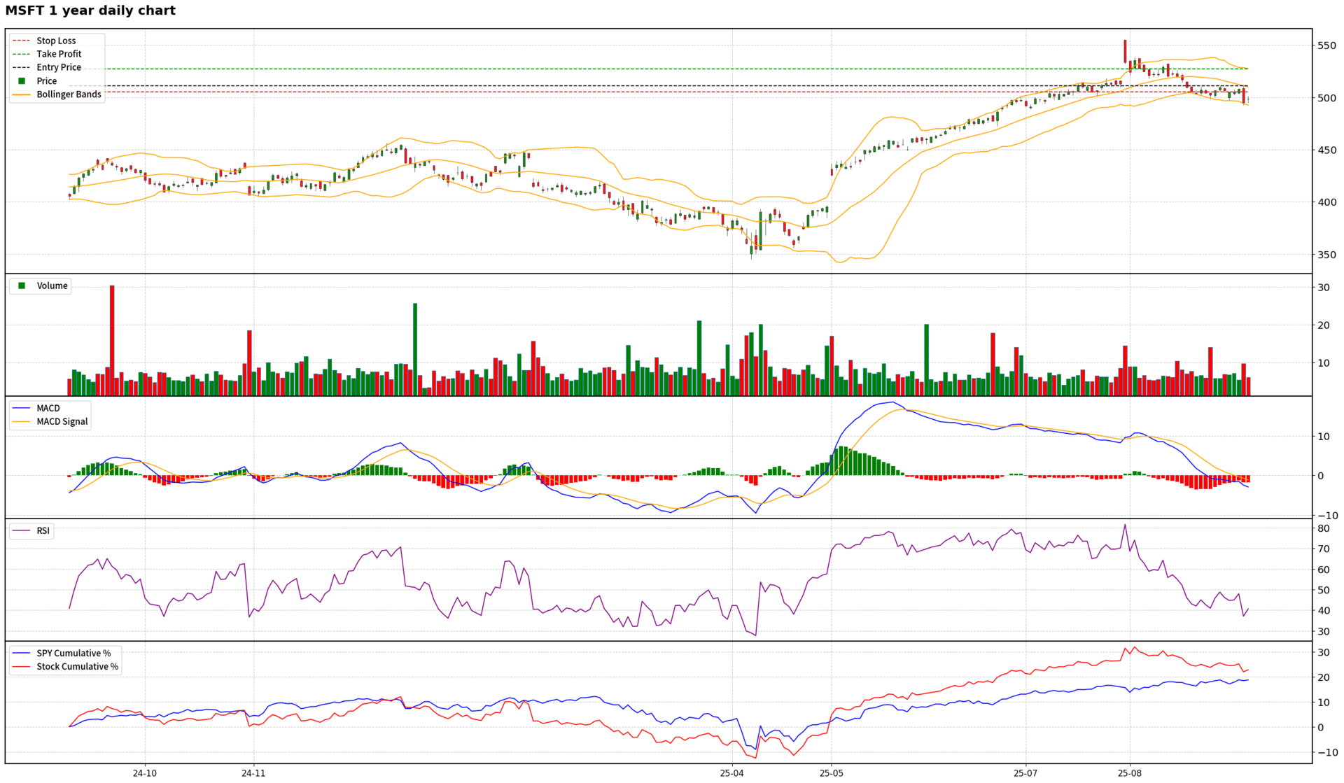 Microsoft presents a compelling long-term investment opportunity driven by its unparalleled leadership in AI and cloud computing, robust financial performance, and strong management confidence. The company's strategic investments in infrastructure and product innovation, coupled with a massive contracted backlog, provide a clear runway for sustained double-digit growth. Analyst sentiment is overwhelmingly positive, reinforcing the high-conviction narrative. However, the stock currently trades at a premium valuation, and intensifying regulatory scrutiny, along with the evolving financial dynamics of the OpenAI partnership, pose short-term risks. Technically, the stock is showing bearish momentum and consolidating near a critical support level. Therefore, a tactical 'Breakthrough' long strategy is recommended, waiting for a clear break above the $510 resistance to confirm a reversal of the short-term downtrend, aligning with the strong underlying fundamentals and long-term growth catalysts while managing immediate technical risks.