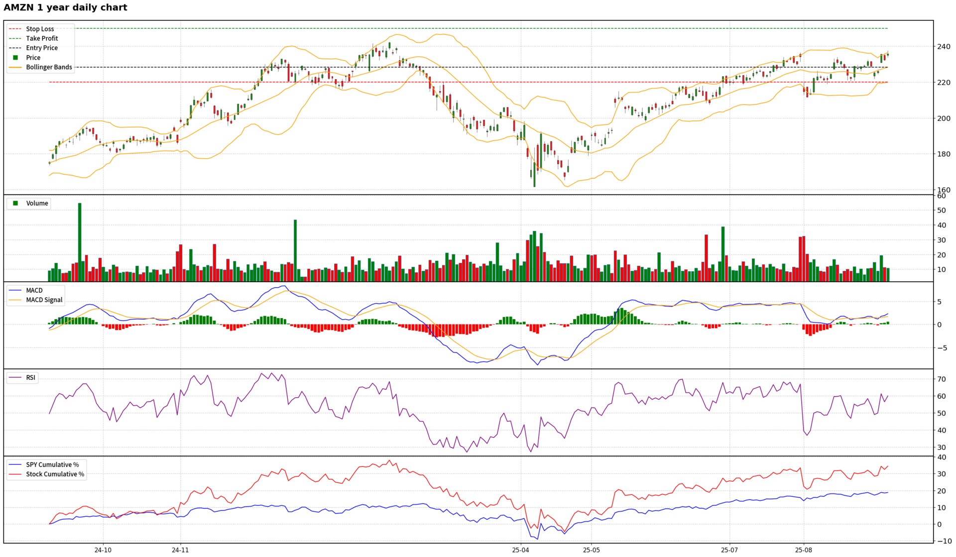 Amazon presents a compelling long-term investment opportunity, driven by its dominant position in cloud computing (AWS) and aggressive, strategic investments in artificial intelligence. Despite high current valuation multiples and some short-term technical overextension, the company's robust financial performance, strong operational execution, and a massive AWS backlog underscore its growth potential. Management's high confidence in strategic initiatives like AI, Project Kuiper, and advertising, coupled with overwhelmingly bullish analyst sentiment, provides a strong foundation. While regulatory scrutiny, AWS supply constraints, and tariff uncertainties pose risks, Amazon's diversified revenue streams, competitive moat, and ability to generate substantial earnings growth for an extended period make it an attractive proposition. A tactical long position, initiated on a short-term pullback to key support levels, is recommended to capitalize on the strong underlying momentum and long-term catalysts.