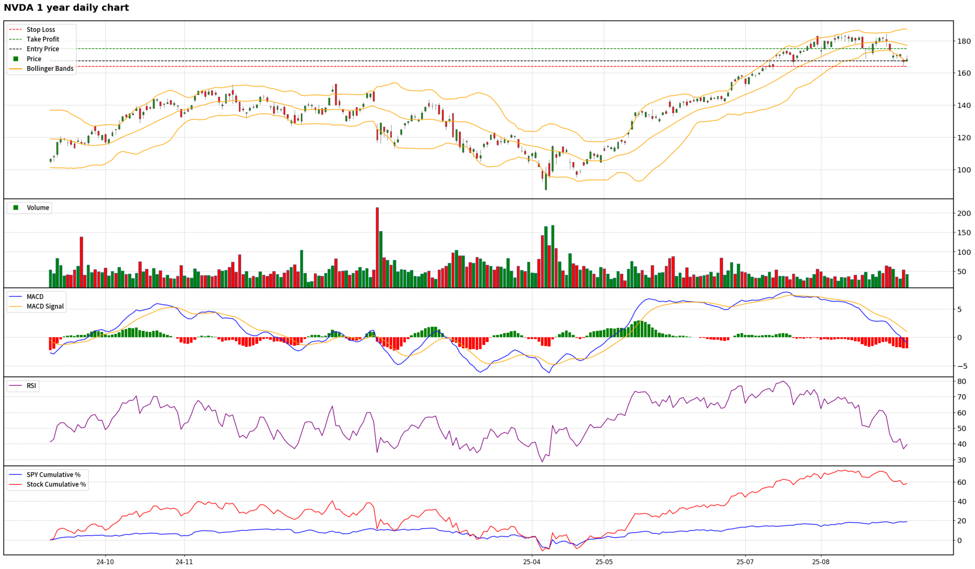 NVIDIA remains a powerhouse at the forefront of the AI revolution, boasting exceptional financial performance, a robust product roadmap (Blackwell, Rubin), and overwhelming analyst support. Management's confidence in the multi-trillion-dollar AI infrastructure market is well-founded, and the company's full-stack approach provides a strong competitive moat. However, the stock's valuation is extremely stretched, trading at a significant premium to peers, and faces intensifying headwinds from US-China geopolitical tensions, which directly impact revenue and market access. Growing competition from major customers developing in-house chips also poses a long-term threat. Technically, the stock is in a short-term downtrend with bearish momentum, but oversold indicators suggest a potential bounce from current support levels. A tactical long position is recommended to capture a short-term rebound, but disciplined risk management with a conservative position size is crucial given the high volatility and significant external risks that could temper future growth.