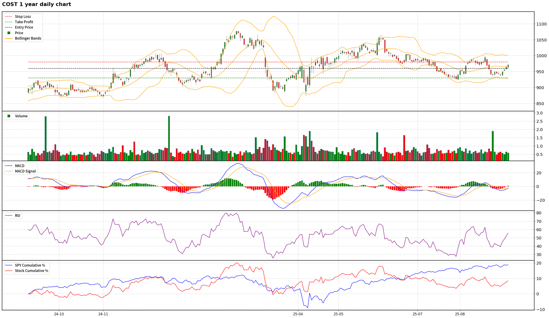 Costco presents a complex investment case. Fundamentally, the company is exceptionally strong, demonstrating robust financial performance, impressive operational growth in membership and e-commerce, and effective management of its value proposition amidst a challenging macroeconomic backdrop. Positive catalysts, including international expansion and a consumer shift towards value, reinforce its long-term resilience. However, the stock is severely overvalued, trading at multiples far exceeding its growth prospects and peer comparisons, as highlighted by extremely low relative valuation scores and analyst concerns. Technically, the stock is in a consolidation phase, showing mixed signals with a potential for a short-term pullback after recent highs, and is currently trading below its 200-day MA. Given the significant valuation overhang and neutral-to-slightly-bearish short-term technicals, a tactical short position is recommended for the coming week, targeting a move towards established support levels. This strategy acknowledges the company's quality but prioritizes disciplined risk management against an unsustainable valuation.