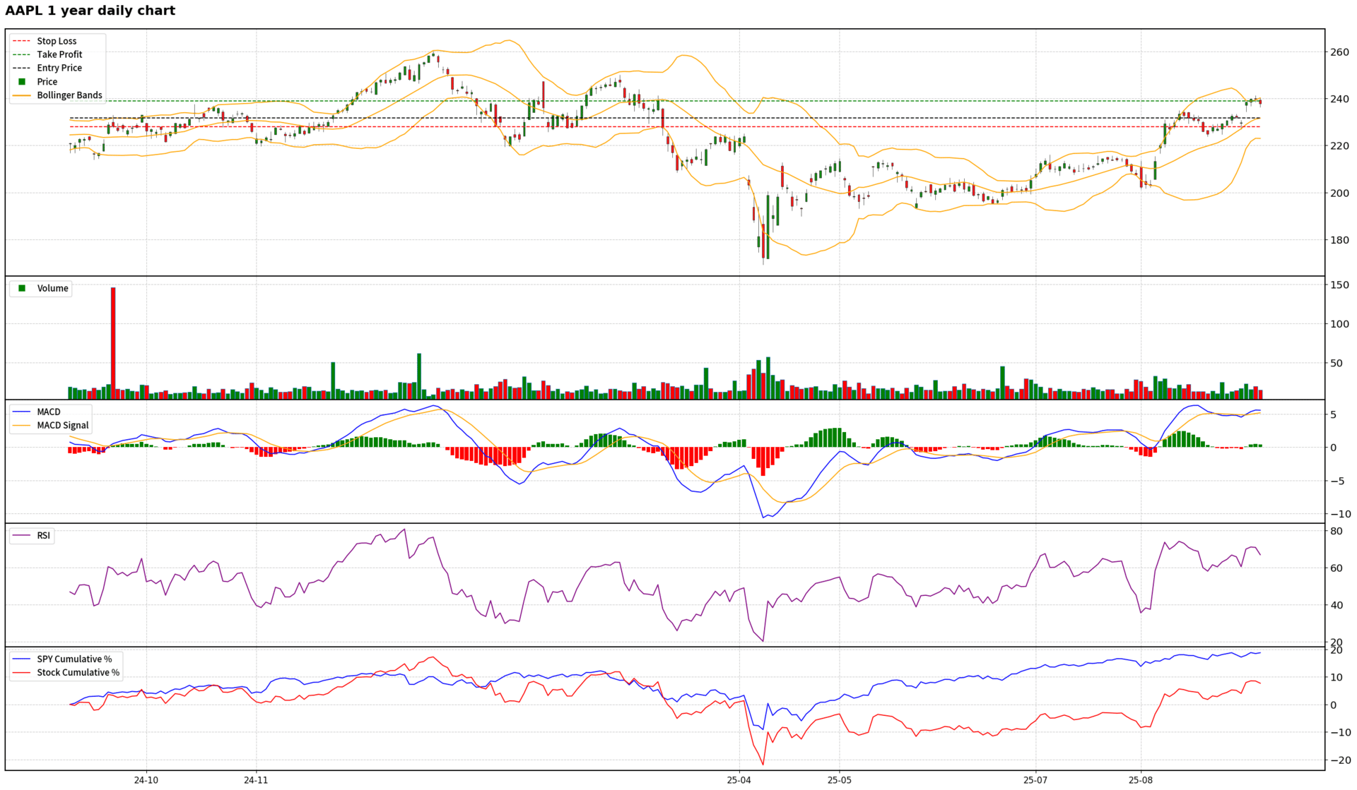 Apple presents a complex investment case. Fundamentally, the company continues to deliver robust financial performance, driven by strong product sales (iPhone, Mac) and accelerating services growth, with a clear strategic focus on AI integration. However, this strength is overshadowed by significant and intensifying global regulatory scrutiny, substantial tariff costs, and a high valuation that appears stretched relative to peers. While upcoming product launches (iPhone 17) and AI advancements offer compelling catalysts, the material financial and operational risks from legal challenges and trade policies cannot be ignored. Technically, the stock is in a strong uptrend but shows signs of being overbought, suggesting a potential near-term pullback. Therefore, a tactical long position on a pullback to key support levels is recommended, emphasizing disciplined risk management due to the prevailing uncertainties and high valuation.