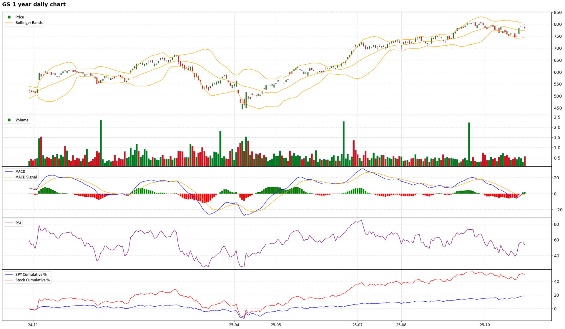 Goldman Sachs presents a compelling long opportunity for medium-term investors, driven by robust fundamental performance and strategic execution. The firm's exceptional Q3 2025 results, marked by significant revenue and earnings growth across its core Global Banking & Markets and Asset & Wealth Management segments, underscore its market leadership and operational strength. Management's high confidence, strategic focus on high-growth areas, and proactive integration of AI position $GS ( ▲ 1.44% ) for sustained future growth. Numerous catalysts, including large mandates, international expansion, and a favorable regulatory outlook, are expected to fuel continued momentum. While analyst sentiment suggests limited immediate upside due to current valuation, and technical indicators signal short-term overbought conditions, these factors are likely to lead to a healthy consolidation rather than a reversal. The broader bullish macro environment, despite its own overextension, provides a supportive backdrop. Any short-term pullback should be viewed as an attractive entry point, as the strong underlying fundamentals and strategic tailwinds are poised to drive $GS ( ▲ 1.44% ) higher over the next 1-3 months, eventually overcoming current resistance levels.